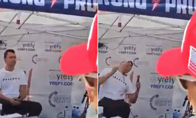 Imagens que circulam nas redes sociais mostram o momento em que o influenciador, no palco de um evento em formato de tenda, leva a mão ao pescoço após o disparo, enquanto o público corre em desespero.
