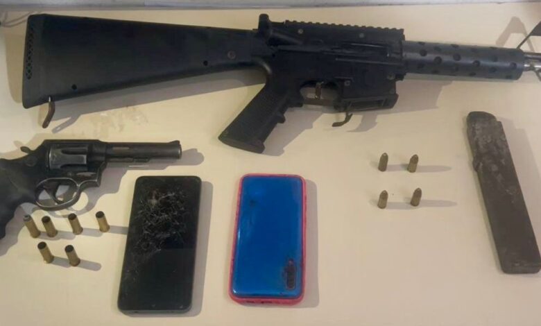 Durante a ação, os policiais apreenderam uma metralhadora calibre 9mm e um revólver calibre .38, ambas com numeração suprimida, além de munições, dois aparelhos celulares e o veículo roubado, que utilizava placa clonada.